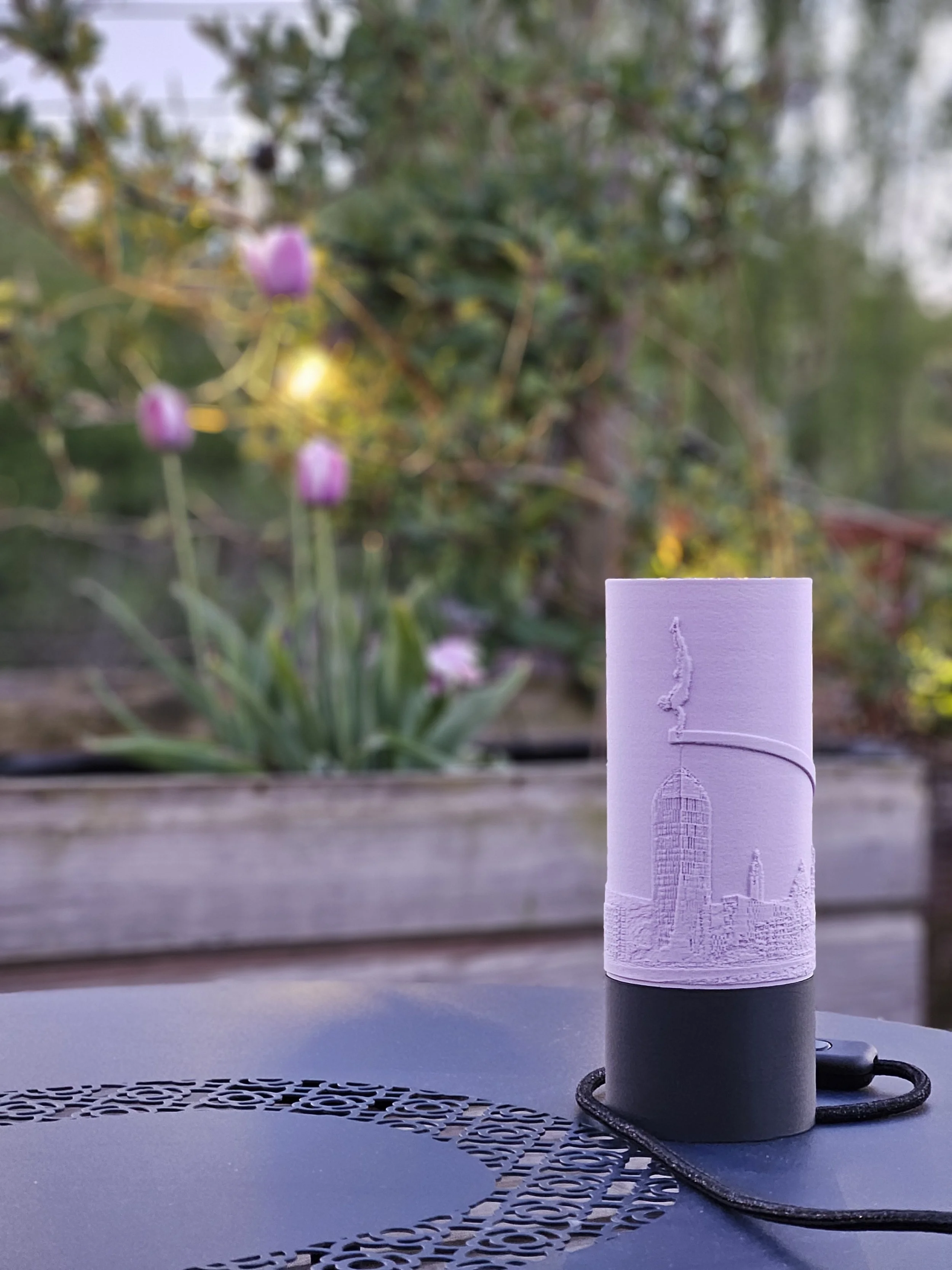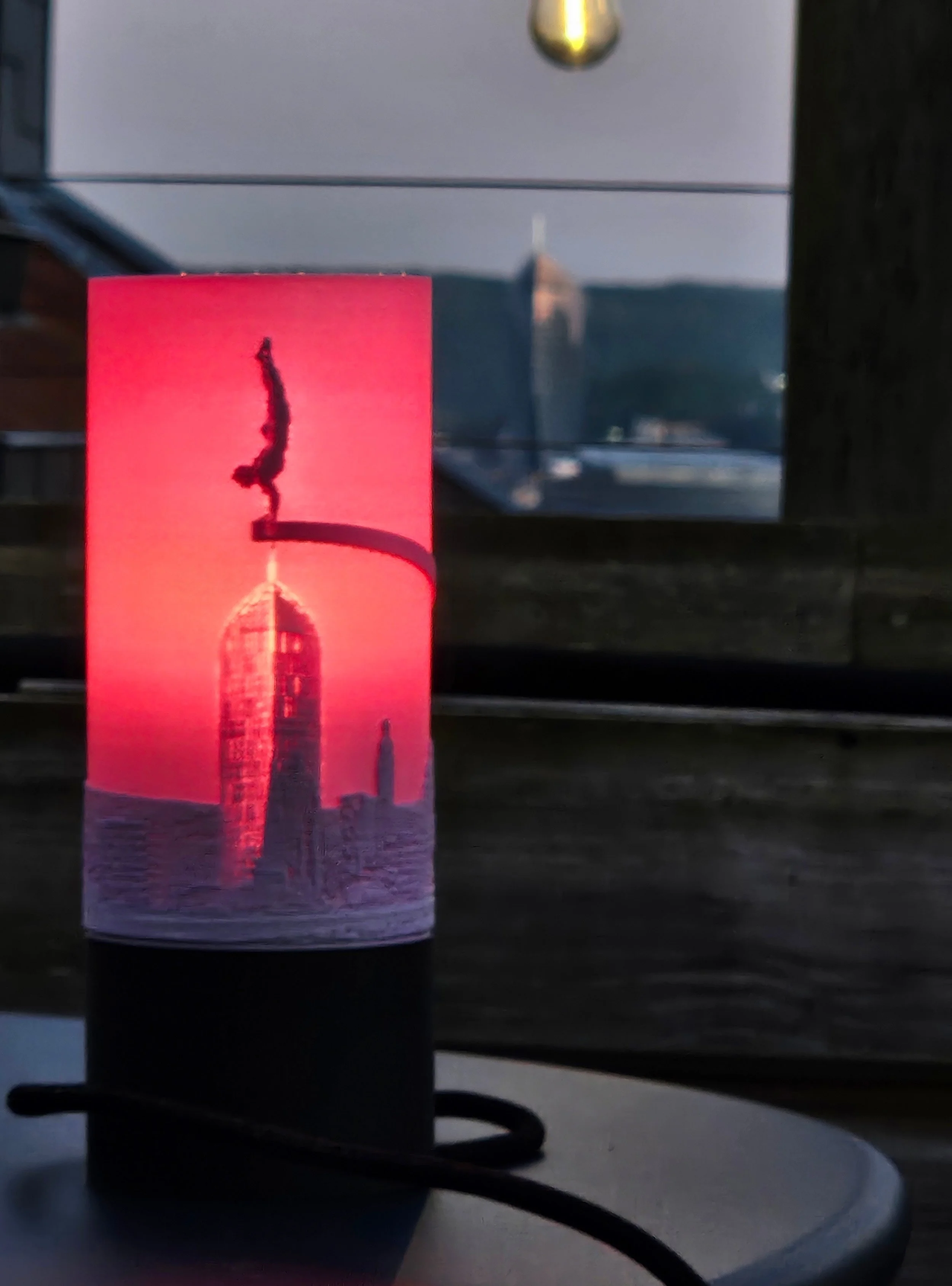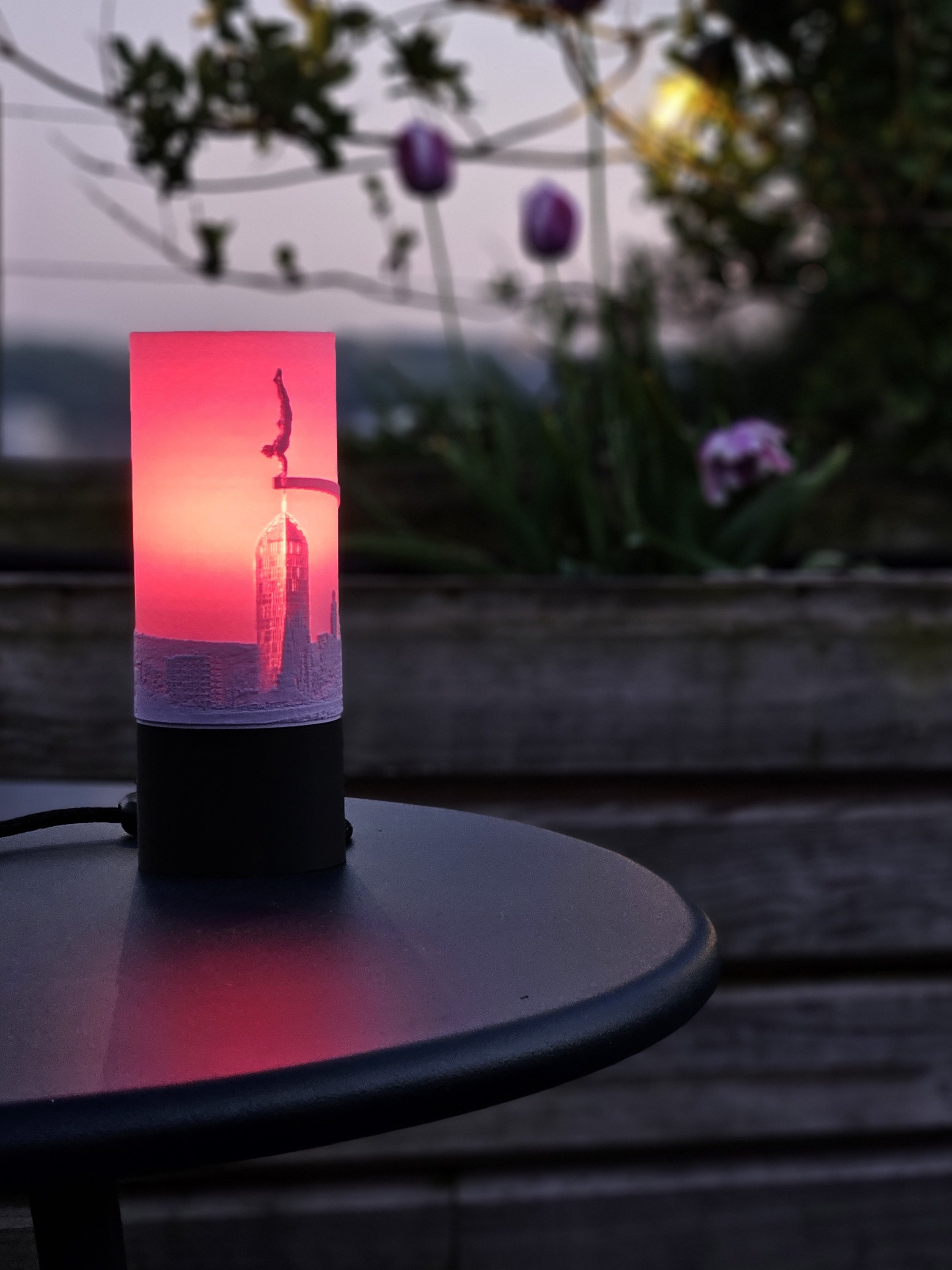 Cette interprétation en lithophanie revisite l’œuvre à travers la lumière. Réalisée en impression 3D à haute résolution, la pièce exploite les variations d’épaisseur du matériau pour faire apparaître l’image lorsque la lampe est allumée. Éteinte, l’objet reste sobre et minimaliste ; allumée, il révèle toute la finesse du motif.